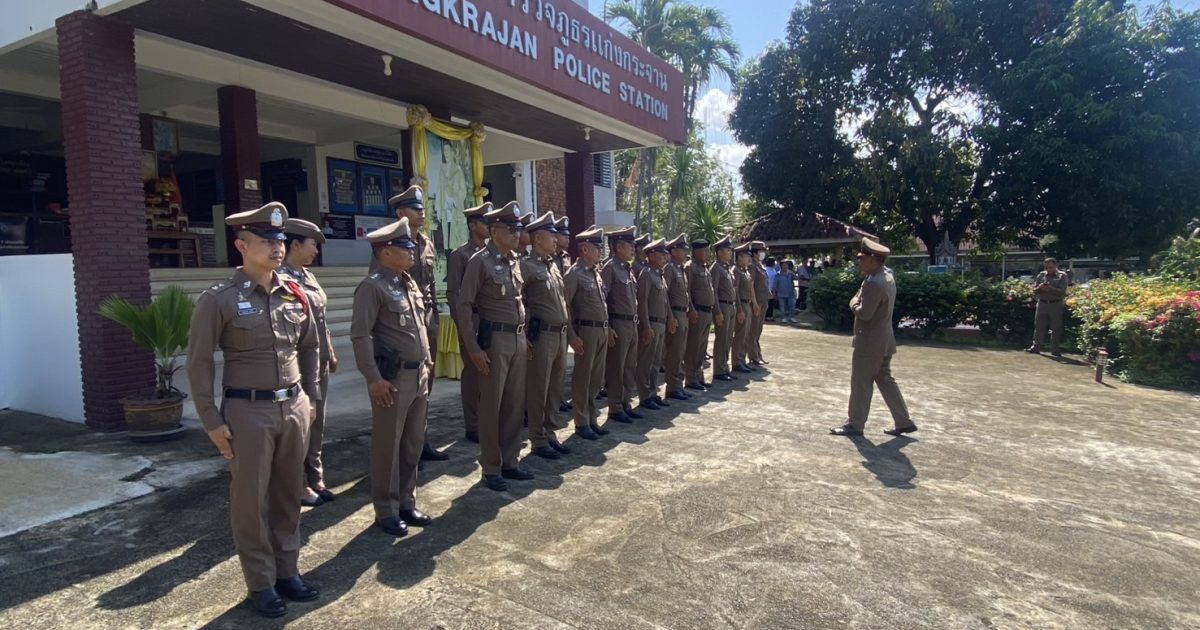 สภ.แก่งกระจาน วันที่ 1 เมษายน 2568 เวลา 07.45 น. พ.ต.อ.ไพฑูรย์ ไม้จันทร์ ผกก.สภ.แก่งกระจาน แก่งกระจาน 2 พ.ต.ท.ชาติชาย เกิดมงคล รอง ผกก.ป.สภ.แก่งกระจาน แก่งกระจาน 21 พ.ต.ต.พงษ์เทพ วัจนามัย สวป.สภ.แก่งกระจาน โทร 085-8340586 อบรมปล่อยแถวสายตรวจชุดที่ 1 ผลัด 08.01-08.00 น. วันที่ 1 เมษายน 2568 สถานที่ปล่อยแถว หน้าสภ.แก่งกระจาน ร้อยเวร 2-0ได้มีการกำชับการปฏิบัติหน้าที่ตามยุทธวิธีตำรวจเพื่อรักษาความสงบเรียบร้อยให้แก่ประชาชนและเน้นย้ำมิให้มีการเรียกรับสินบนหรือผลประโยชน์ใดใดในการปฏิบัติหน้าที่เด็ดขาดทั้งทางวินัยและทางอาญา โดยกำชับให้ปฏิบัติตนตามนโยบายอย่างเคร่งครัด
