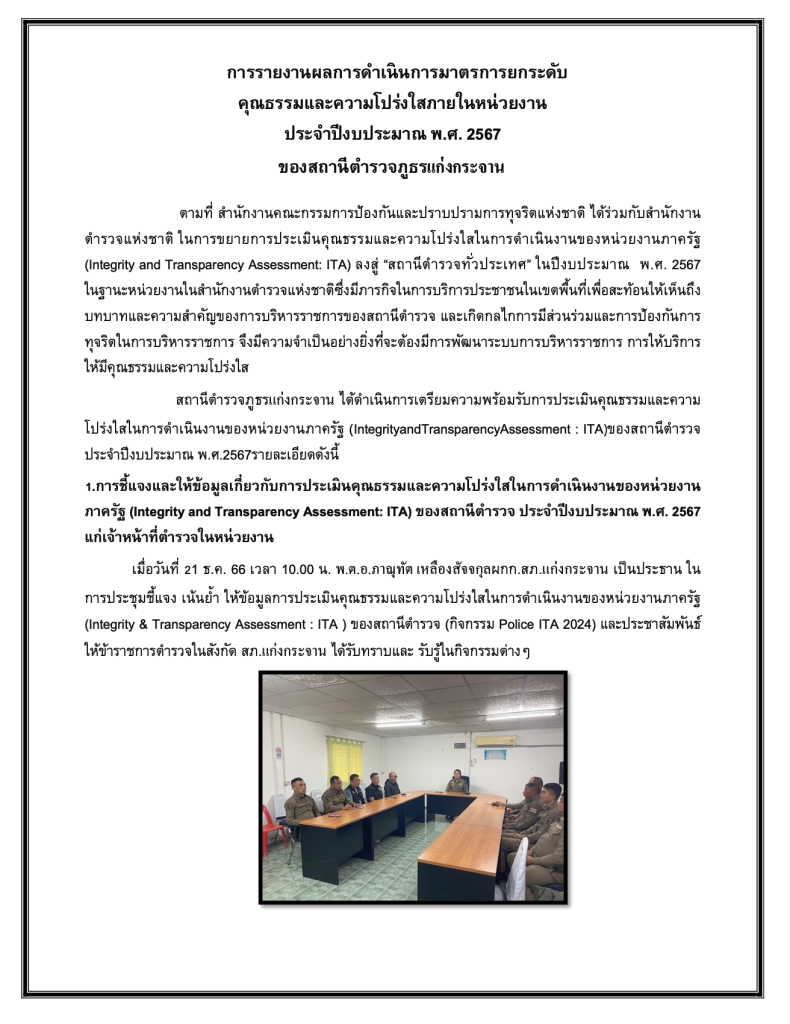 สถานีตำรวจภูธรแก่งกระจาน ได้ดำเนินการประชุมขับเคลื่อนการประเมินคุณธรรมและความโปร่งใส